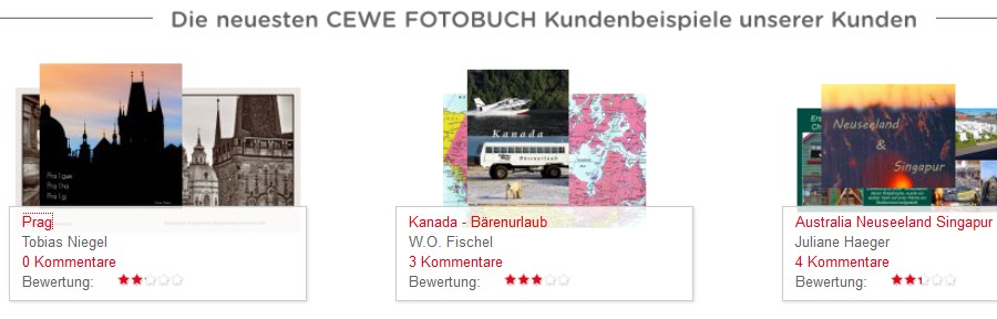 Oder: Um es mal konkret als Beispiel zu bringen (was natürlich nur rein hypothetisch ist und so nicht funktioniert): Wenn ich jetzt in diesem Augenblick ein Beispiel einreichen würde, und bei CEWE sässe nun jemand, dem es nur in den Fingern juckt, mein Beispiel freizugeben - was würde dann passieren? Von der Logik her doch, dass eins der beiden "alten" Kundenbeispiele auch aus der Dreierliste fällt, die in dem Screenshot von DSL-schnell zu sehen waren? Immer natürlich unter der Voraussetzung, dass der Browser-Cache zwischenzeitlich geleert wurde.