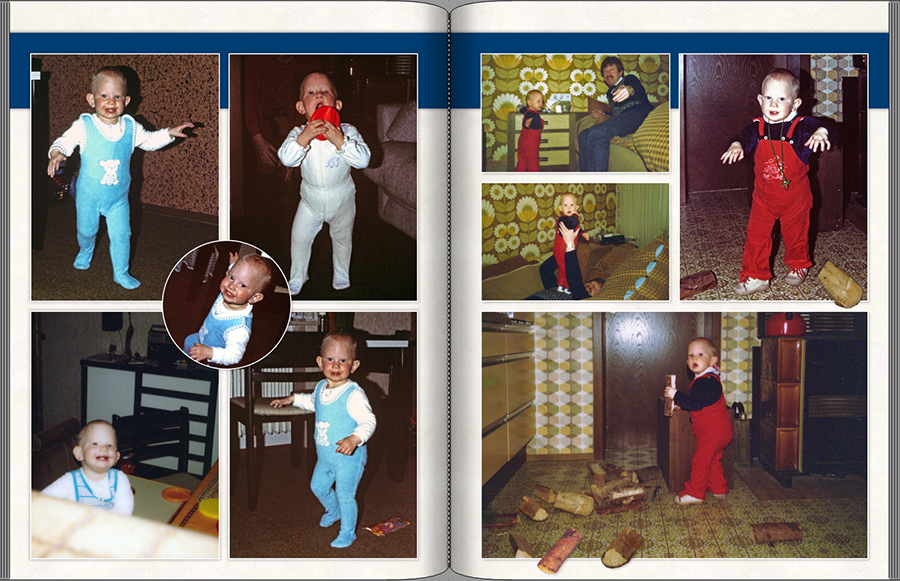 Der blaue Farbstreifen zieht sich identisch durch das ganze Buch und dient u. a. als Unterlage für Jahreszahlen, kleine Texte ect. Ein Beispiel aus meinem noch unfertigen Jahrbuch 1982: Liebe Grüße