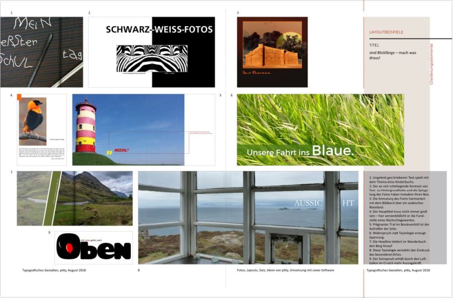 Hier ein Ausschnitt zum Gucken: https://www.dropbox.com/s/nhahf5pkqctlq ... 1.pdf?dl=0 Ich wäre jetzt fertig. Ich habe aber noch vier Doppelseiten frei. Habt Ihr Anregungen, was ich noch erarbeiten sollte? Wenn Ihr Ideen habt, was in dieses Anwendungsbüchlein gehören könnte, wenn Ihr Fehler findet, Fragen habt oder sonstige Anregungen, bitte gerne im Beitrag Fragen zum typografischen Glossar: https://www.cewe-community.com/forum/vi ... 93#p127793 Lieber Gruß, pitty