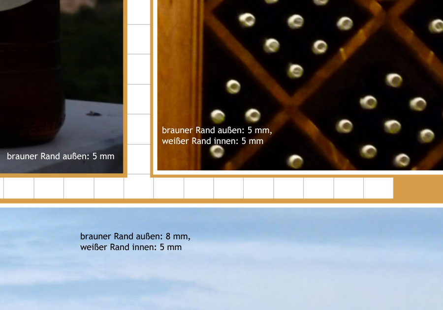 Ich habe zwei Fotos exakt übereinander gelegt - mit Hilfe der Gitternetzlinien und Hufeisenfunktion.Das untere Bild (völlig schnurz, was darauf zu sehen ist), hat den äußeren breiteren und in diesem Beispiel braunen Rahmen. Das obere Bild, das ich im Projekt zeigen möchte, hat den inneren schmalen und in diesem Beispiel weißen Rahmen. Ich hoffe, ich konnte Dir helfen. Ich werde nach Druck berichten, wie die Rahmenbreite tatsächlich ausgefallen ist. Lieber Gruß, pitty