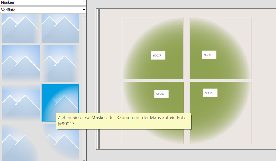 Tanja hat schon die richtigen Verläufe gepostet, man erkennt sie wahrscheinlich erst beim zweiten Mal hingucken. Sie liegen auf den inneren Rahmen der Bilder und man erkennt auf dem linken Bild einen Zwischenraum zum Außenrahmen. Ich hatte auch erst gedacht, es sind die falschen Beispiele. Ansonsten trifft deine Antwort zum Problem aber genau ins Schwarze. Man muß leider auf andere Masken ausweichen.
