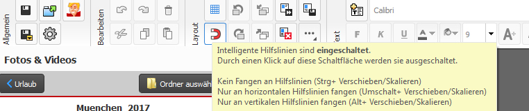 Beschreibung: Hallo ihr alle, Früher haben sich bei den Fotos, die ich in mein Cewe Fotobuch eingeführt habe solche gestrichelte Linien gebildet, die angezeigt haben, in welchem Abstand Bilder zueinander stehen (die Bilder konnte ich dann einfach an die anderen Bilder anpassen, sodass sie auf gleicher Höhe waren - sobald man die Fotos losgelassen hat, sind die gestrichelten Linien verschwunden). Jetzt sind diese Linien jedoch ganz verschwunden. Wie bekomme ich die wieder her???? Vielen Dank schonmal!!! P.S. ich meine nicht die Gitternetzlinien.....