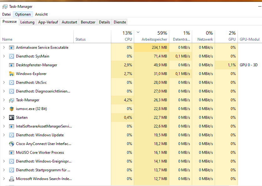vielen Dank für Deine Antwort. Ich habe alle Schritte durchgeführt und konnte so den freien Arbeitsspeicher auf ca. 1.5 GB erhöhen. Aber mehr geht irgendwie nicht. Wie man auf dem Screen Shot des Task-Managers sieht, waren außer dem unvermeidlichen Virenprogramm keine nenneswerten Prozesse am laufen. Trotzdem hat es nicht gereicht, Fotowelt wollte sich wieder nicht öffnen (ja ok, es waren statt der 2 GB ja auch nur 1.5 GB frei verfügbar). Was mache ich denn jetzt? Viele Grüße Knut Re: Neue Version 7.01.04Hallo Knut,