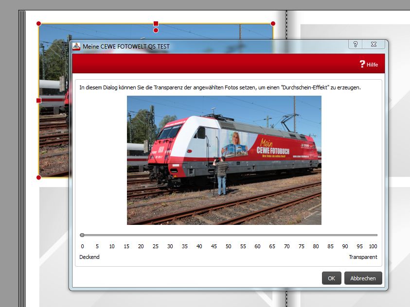 Versionsnummer: 5.0.0 Handelspartner: Budni Beschreibung: Hallo CEWE-Team, seit einiger Zeit arbeite ich mit der Version 5.0.0 von Budni, die ja auch Transparenz bei Fotos erlaubt. Ich hätte nun zukünftig gern eine Werteskala bzw. ein Eingabefeld, um bei mehreren Fotos dieselben Werte für Transparenz eingeben zu können. Gruß Kikii Re: TransparenzIch hab's noch nicht probiert, aber vielleicht geht ja folgender workaround: