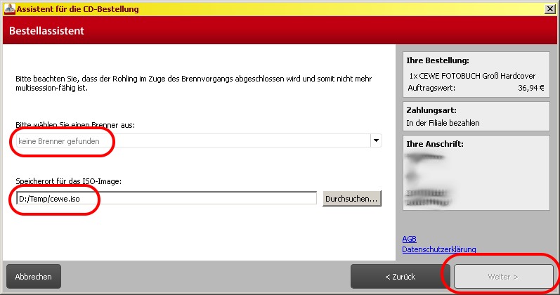 ich habe versucht CD zu brennen. Prinzipiell müsste wohl die seid Freitag zur Verfügung stehende Forum-Version zu brennen gehen? Oder? Komisch ist dann, dass mein altes Buch auch nicht funktioniert. Vielleicht habe ich ja was falsch eingestellt. Ich konnte beim Bestellvorgang im Schritt "CD brennen" zwischen "ISO Datei" (da wusste ich nicht was das ist) und "IMAPI: HL-ST RW/DVD MU10N" wählen (siehe Anhang). Das ist ja sicher mein CD-Laufwerk. :roll: LG KerstinG Re: CD Bestellung mit neuer Version 5.1.3Dein Weg ist schon richtig.