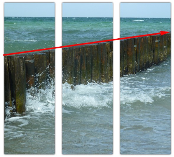 Okular hat das sehr schön bildlich aufgefasst. Besser kann ich es gar nicht beschreiben :) Im ersten Moment erscheint es Ihnen vielleicht schade, dass ein Teil "wegfällt" jedoch sorgt gerade dies dafür, dass der Gesamteindruck erhalten bleibt. Auf den Beispielbildern von Okular kann man gut erkennen, dass Linien in Bilder so gestört werden würden. Man könnte sogar sagen, dass aus der einen Linie (roter Pfeil) im unteren Beispiel 3 Linien entstehen, weil jede eine eigene Flucht hat. Bei dem Beispielbild mit der Blume, dass Sie gewählt haben, ist der Wegfall schon störend, da die Trennung direkt auf dem Hauptmotiv verläuft. Bei Mehrteiler empfiehlt es sich wichtige Bildteile nicht auf die Trennung zu legen. Ich habe vor einiger Zeit einen Beitrag verfasst, wie man Porträts auf Mehrteilern anordnen kann. Diese Gestaltungsmöglichkeiten funktionieren jedoch auch bei anderen Motiven wie Blumen: Mehrteiler – machen Sie mehr aus Ihren Porträts Liebe Grüße