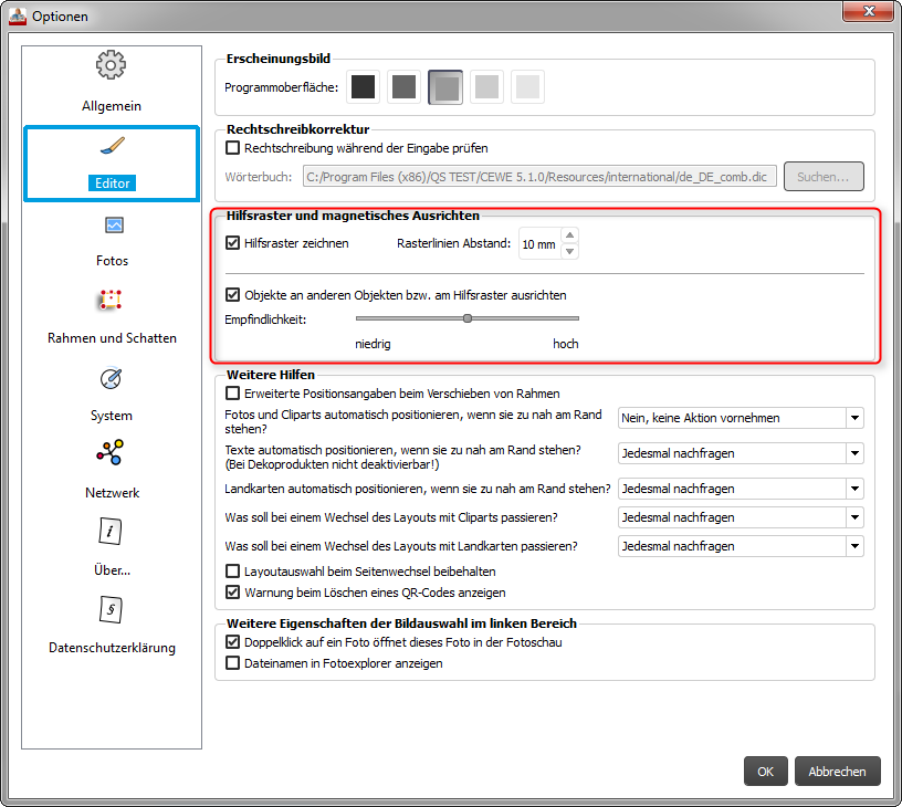 Als besonders hilfreich für die Arbeit mit selbstgestalteten Layouts können sich Orientierungslinien erweisen. Um diese in der Software einzuschalten, können Sie ein Hilfsraster erstellen. Dieses finden Sie in den Optionen unter dem Punkt Editor.