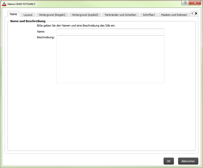 Wie auch der Vorlagenvorschau finden Sie im Editor für eigene Stile mehrere Reiter, mit denen Sie durch die Einstellungen navigieren können. Diese Einstellungen können Sie in Ihren eigenen Stilen vornehmen: Layout, Hintergrund, Farbränder und Schatten, Schriftart, Masken und Rahmen und Cliparts.