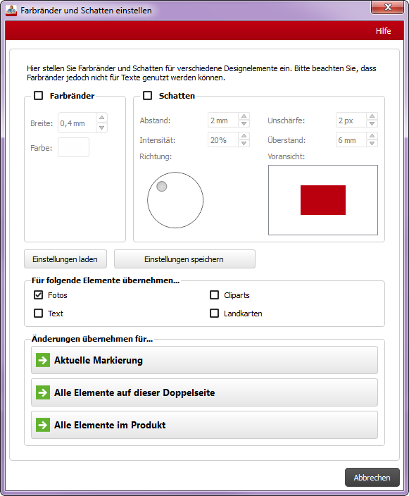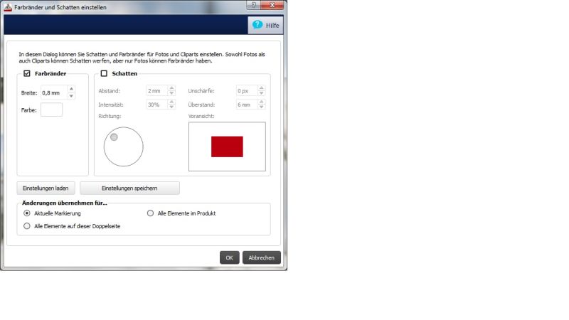 Da ich meine Freude darüber gerne mit Ihren teilen möchte, werde ich hier nochmal ein bisschen mehr ins Detail gehen. Seit Schatten auch hinter Texten möglich sind, hat dies zu einigen Unstimmigkeiten geführt. Wollte man alle Schatten in einem Produkt anpassen, hatte man nun schnell Schatten auch hinter Textelementen, was nicht gewünscht war. In den Rahmen- und Schatteneinstellungen finden Sie deshalb zukünftig die Möglichkeit eine Auswahl zu treffen, auf welche Elemente Sie Ihre Einstellungen anwenden möchten. Hier ein Screenshot dazu: