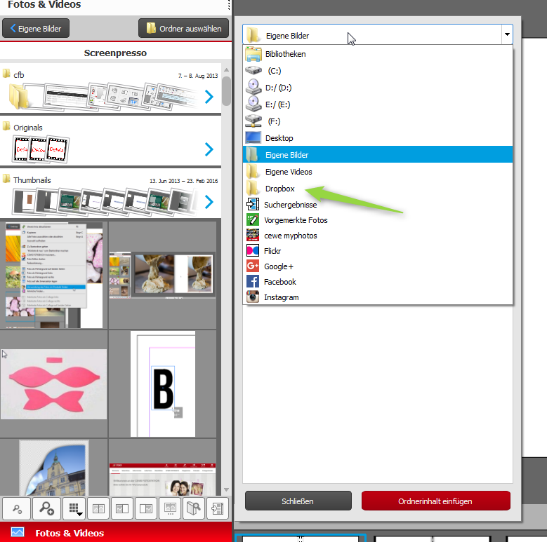 wie bereits von den anderen Forenteilnehmern erwähnt, können Sie über den Button "Ordner auswählen" und über das sich öffnende Menü auch eine Dropboxanbindung finden. Öffnen Sie dort einfach das Auswahlmenü: Liebe Grüße