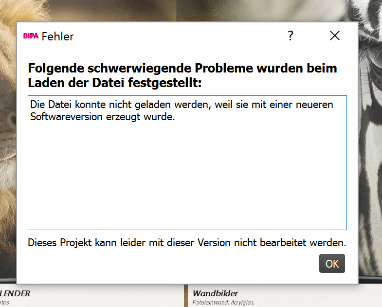 Re: Fotobuch läßt sich nicht mehr öffnen !!Crusella hat geschrieben: Folgende schwerwiegende Probleme wurden beim Laden der Datei festgestellt: