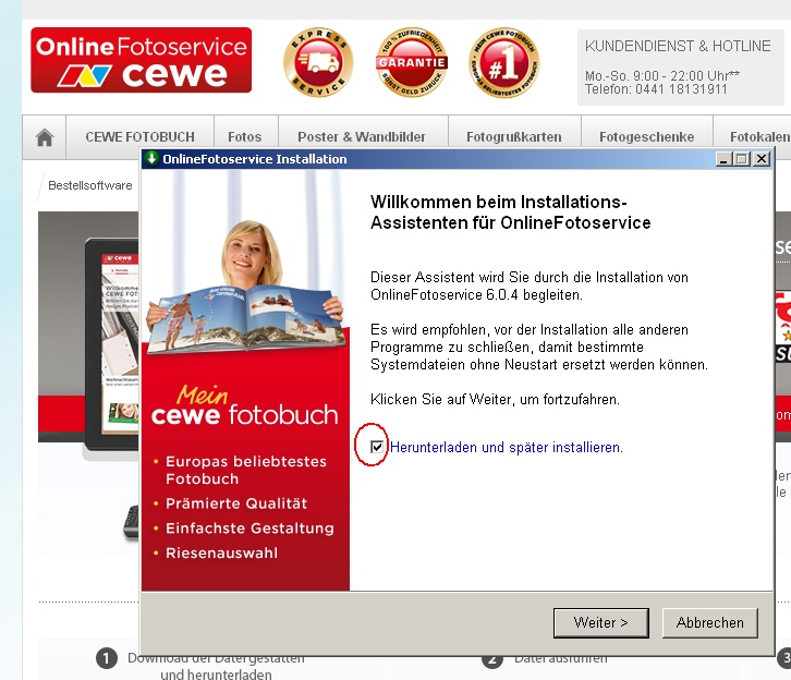 Du kannst aber auch die Version 6.0.4 von onlineFotoservice neu installieren. Dafür setzt du das Häkchen bei "Herunterladen und später installieren". Wenn die Software heruntergeladen ist, suchst du sie im Downloadordner und startest von dort die Installation über die setup_...exe.