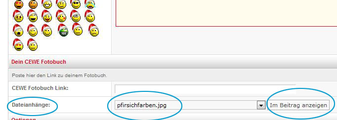 5.) Jetzt musst Du noch die Datei im Beitrag anzeigen lassen. Dazu klickst Du an die Stelle in Deinem Beitrag, wo das Bild stehen soll und klickst dann auf "Im Beitrag anzeigen"