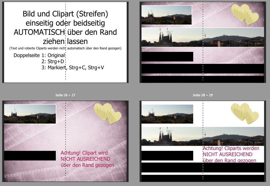 Ich war vorhin in Eile, da hat sich ein Fehler eingeschlichen. Nur die Cliparts haben den Überstand verloren, bei den Fotos war er geblieben.Elemente, die von der Automatik über einen Rand gezogen wurden oder beim C&P über beide Ränder, verlieren den Überstand beim Einfügen. liebe Grüße