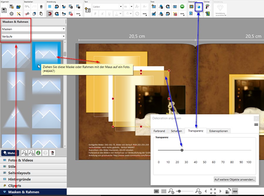 Um in der CEWE-Software einen Verlauf nutzen zu können für den "Glanz", musst du ein einfarbiges Bild benutzen.