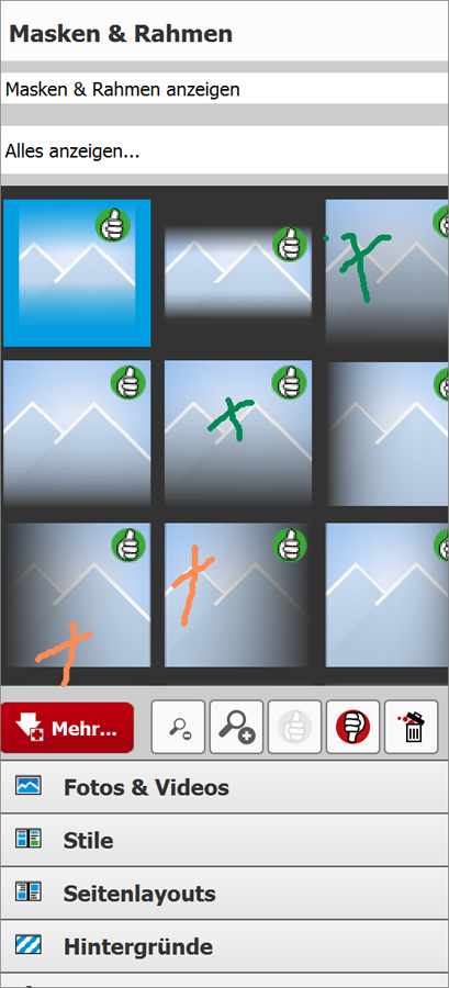 bei Masken&Rahmen -> Verläufe hat Josefia Verläufe in der Art wie die mit dem grünen Kreuz markierten verwendet (und dann das Bild gedreht). Die Verläufe, die ich verwendet habe, habe ich mit einem orangen Kreuz markiert.