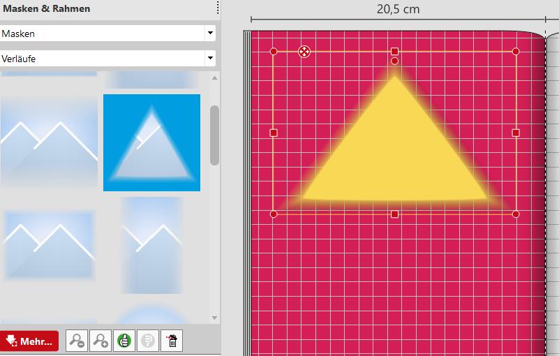 Ich habe mich exakt an Deine Beschreibung und den Screenshot gehalten. Bei Masken & Rahmen -> Masken -> Verläufe gibt es bei mir nur 10 Möglichkeiten. Z.B. Hochkant und Dreieck sind nicht dabei. Wenn ich die waagerechte Fläche anwende, werden nur die Ecken abgerundet.