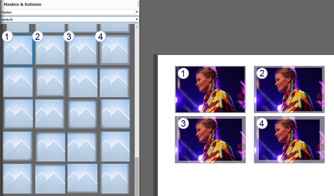 Mit der Funktion "als Favorit markieren" können Sie sich Ihre beliebtesten Verläufe in einem eigenen Bereich ablegen. Unsere Masken entsprechend der Effektstärke und der jeweiligen Ausführung sortiert. Ich sehe aber gerade, dass einige Dateien sich dieser Vorgehensweise nicht anpassen. Das gebe ich gerne an die Kollegen weiter. Sylke Re: Passepartouts/Hindergründe Anordnung im AuswahlbereichBei dieser Gelegenheit wünsche ich mir gleich nochmal ("steter Tropfen .."