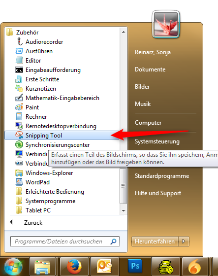 Versuchen Sie dafür zuerst Ihre Software zu öffnen, sodass die Fehlermeldung erscheint. Schließen Sie diese jedoch noch nicht, sondern öffnen Sie über den Bereich "Alle Programme" und dann in der Katergorie Zubehör das Snipping Tool.