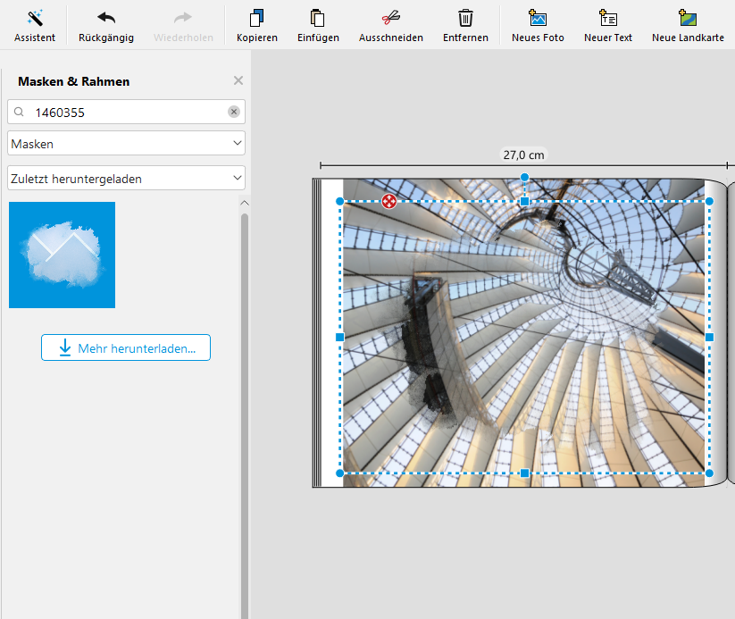 Ich platziere ein hochformatiges Bild auf der Seite, ändere die Maße auf 31,4 x 31,9 und zentriere das Bild (ALT+HV). Ich lege den Ausschnitt fest, kopiere dann das Bild und richte es mit ALT+HV deckungsgleich auf dem ersten Bild aus. Beim Auflegen der Maske #1460355 reduziert sich das Höhenmaß bei meinem Beispiel automatisch auf 22,9 cm. Die Höhe gleiche ich an auf 25,0 cm und richte dann den Ausschnitt aus. Hierbei ist es dann so, dass ich mir z.B. rechts oben eine markante Stelle suche, die sich gut angleichen lässt. "Hüpft" der Ausschnitt beim Anklicken des maskierten Bildes nicht mehr, weiß ich normalerweise, dass ich fertig bin und die Motive deckungsgleich angeordnet sind. Bei dieser Maske ist es allerdings so, dass wenn rechts oben nichts mehr hüpft, rechts unten der Ausschnitt weiterhin hüpft. Das kann ja eigentlich nicht sein, denn es müsste ja an allen Punkten jetzt passen. Vielleicht ist Zoomfaktor der falsche Begriff. Vielleicht ist es eher eine leichte Verzerrung.