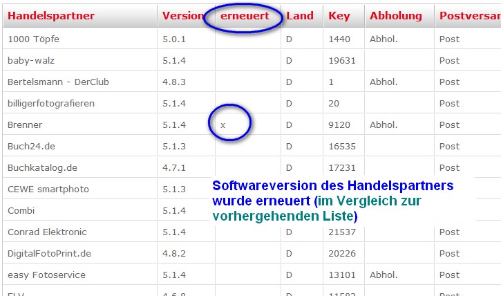 In der Liste gibt es eine Spalte "erneuert". Dort ist eine Markierung eingetragen, wenn ich beim Handelspartner im Vergleich zu meiner vorhergehenden Auflistung ein Update entdeckt habe.