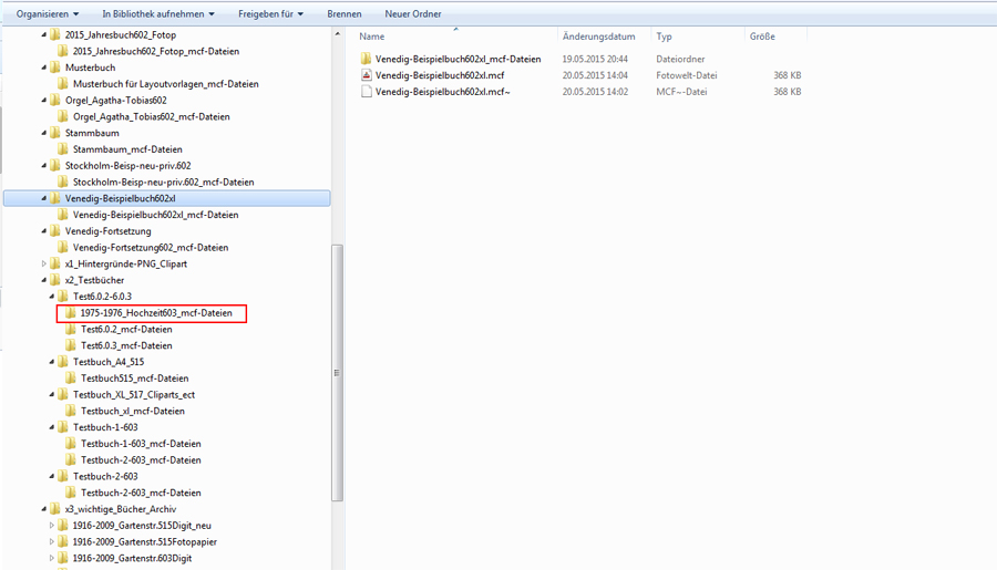 Mein Problem ist wahrscheinlich meine Ordnerstruktur. Da ich eine für mich übersichtliche Anordnung der Bücher haben möchte und vor allem bei der Datensicherung alle Daten eines bestimmten Buchs unter einem Datei-Ordner habe, trat bei mir das Problem auf, dass ich plötzlich die mcf-Datei meines Hochzeitsbuchs unter den Testbüchern hatte, weil eines davon zufällig vorher in Bearbeitung war - siehe Anhang.... Liebe Grüße