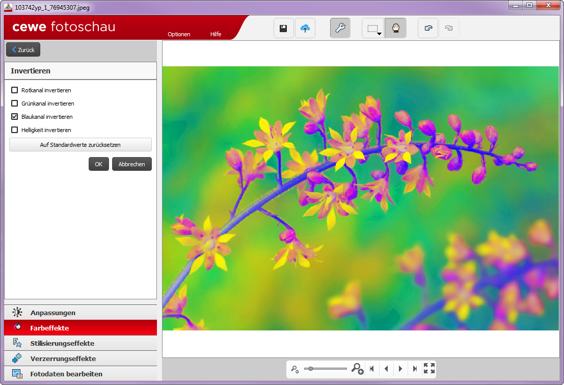 Eine Möglichkeit diesen Effekt mit der Fotoschau zu erstellen ist die kanalgesteuerte Invertierung. Diese Bearbeitung finden Sie unter Farbeffekte und Invertieren. In dem Sie hier unterschiedliche Kanale zu- oder wegschalten verändert sich die Farbgebung Ihres Bildes. Neben den drei Farbkanälen können Sie außerdem auch die Helligkeit invertieren, um eine spannende Farbgebung zu erzielen. Probieren Sie hier einfach aus, welche Farbkombination Ihnen am besten gefällt.