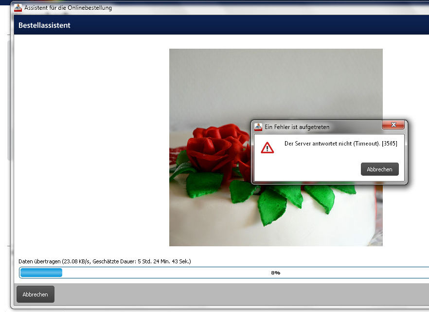 Hallo Josefia, das muß am CEWE-Server liegen. Ich habe vor 2 Wochen 2 Bücher (98+82Seiten, 603) in unter 45 min geladen.