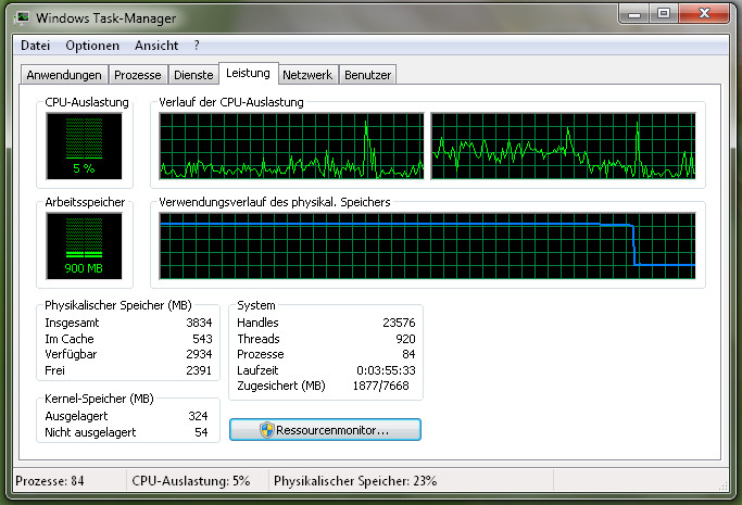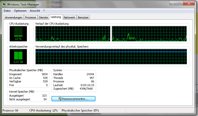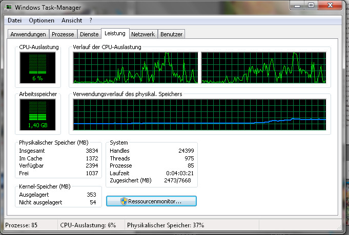 Parallel habe ich den Task-Manager beobachtet und habe den Eindruck, dass meine 4 GB RAM nicht ausreichen bei dieser Version.