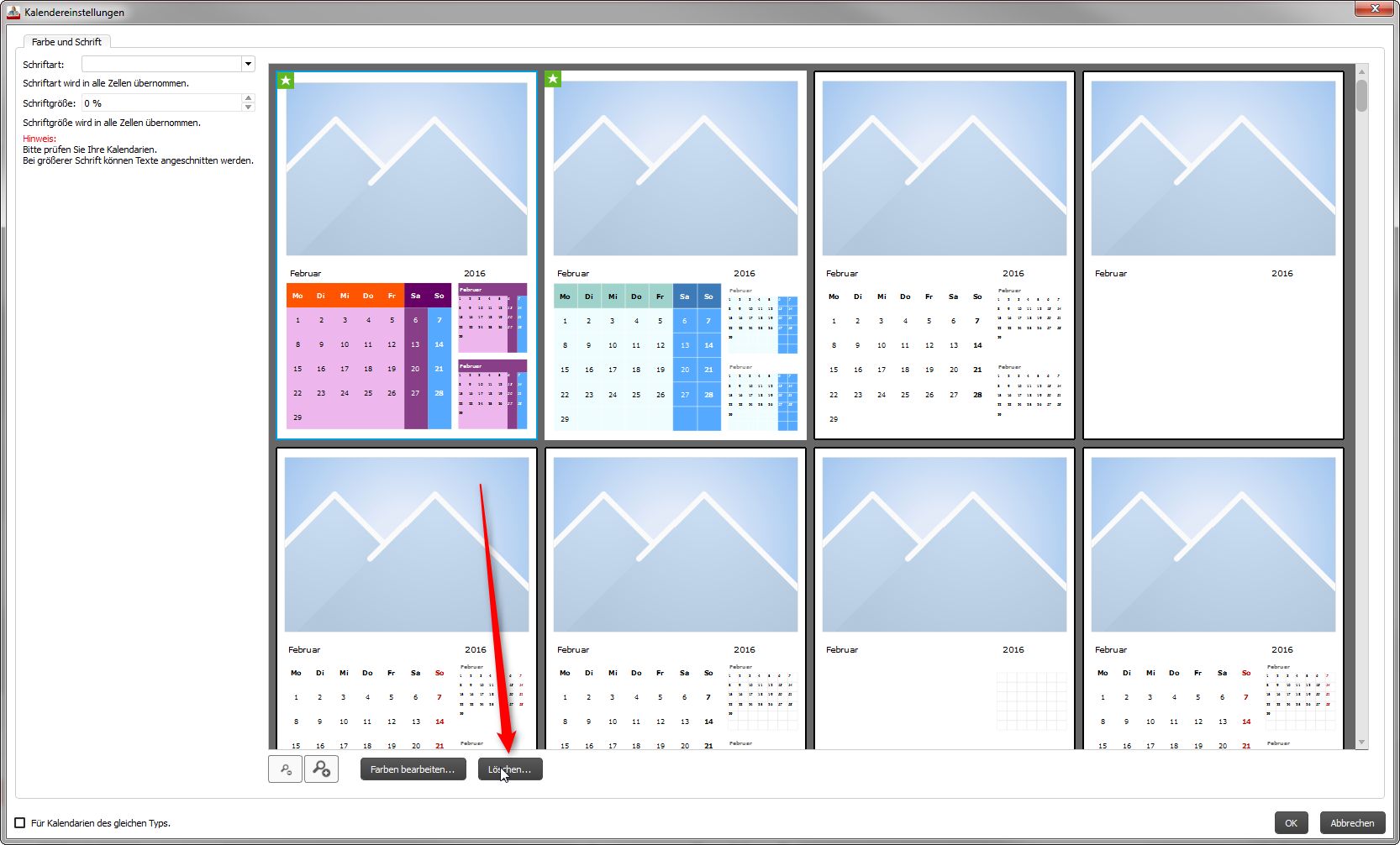 Hier können Sie zwischen einigen Grundfarben und Schriften für Ihr Kalendarium wählen. Dies kennen Sie bereits aus unseren älteren Softwareversionen. Für viele kreative Köpfe ist dies jedoch nicht genug Individualität. Wenn Sie noch tiefer in die Gestaltung eingreifen möchten, können Sie nun unterhalb der Farbvorschlage auf „Farben bearbeiten…“ klicken.