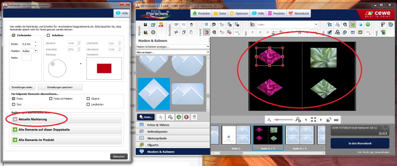 Versionsnummer: 6.1.3 Handelspartner: dm Beschreibung: Hallo, bei der neuen Version scheind sich ein Fehler eingschlichen zu haben. Ich füge ein Bild ein indem ich es einfach aus dem Fotoordner links in mein Fotobuch ziehe. Es bekommt automatischen einen weißen Rahmen. Ich markiere das Bild und entferne diesen Rahmen. Danach gehe ich in Masken und Rahmen und lege mir die Rautenmaske darüber damit ich ein Rauternbild bekomme. Soweit so gut. J Ein neues Bild einfügen, wieder der automatische Rahmen, hole mir jetzt die Rautenmaske und mein Rautenbild hat auch einen Rahmen. Auch schön. Jetzt möchte ich aber meine Seite ganz ohne Rahmen haben. Gehe wieder oben auf Rahmeneinstellung und sage keinen Rahmen "Alle Elemente auf der Doppelseite" und bei den normalen Bilder wird der Rahmen entfernt, bei dem Rautenbild bleibt er bestehen. Markiere ich jetzt das Rautenbild und wähle oben Rahmeneinstellung kann ich "Aktuelle Markierung" nicht auswählen. Wähle ich einen Rahmen "Alle Elemente auf der Doppelseite" wird nur das viereckige Bild berahmt. Auch wenn ich über einen Rahmenbild einen Verlauf lege und anschließend den Rahmen entfernen möchte, klappt es nicht. Nur wenn ich die Bilder ganz lösche und alles wieder von vorne aufbaue, bekomme ich es so hin wie ich es gerne hätte. Gruß
