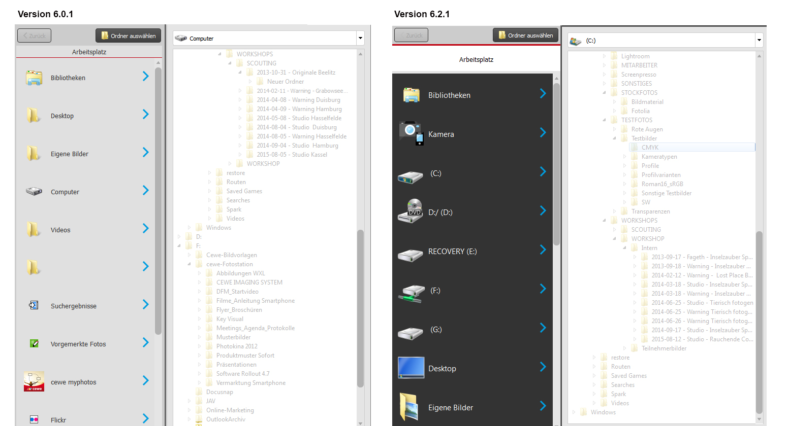 Ergänzung: Bei der 6.0.1 sehen Sie im oberen Bereich als Auswahl "Computer" (also alle Laufwerke des Rechners, an dem Sie arbeiten) und bei der 6.2.1 nur genau 1 Laufwerk - dort ist es auch nicht möglich "Computer" auszuwählen.