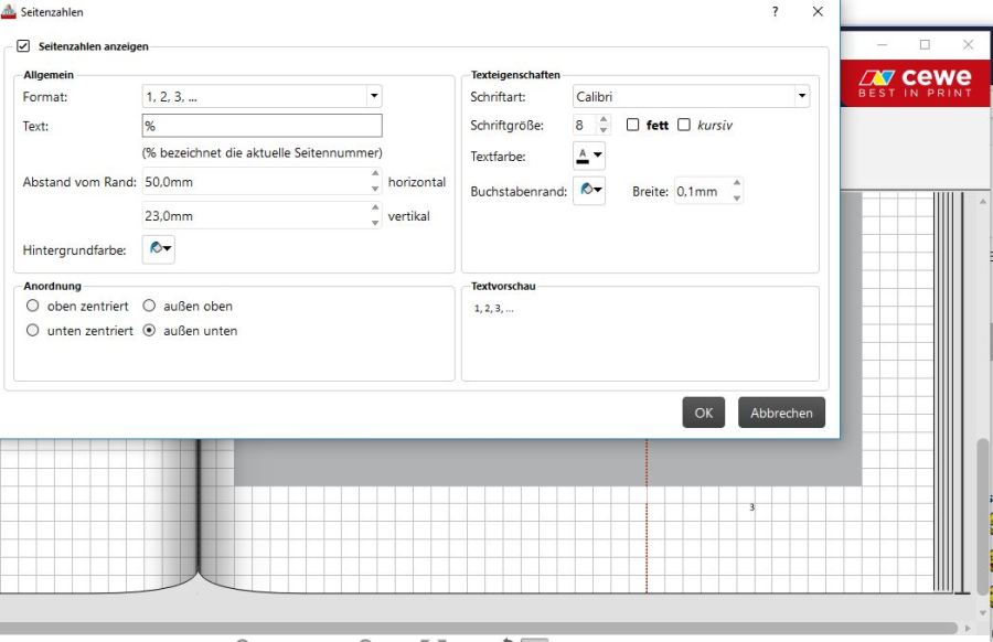 Ich sehe im Bearbeitungsfenster keine Möglichkeit, Einfluss auf die Platzierung von Pagina und Kolumne in Abhängigkeit der linken oder rechten Seite zu nehmen. Dann sollte aber die übliche gespiegelte Anordnung automatisch angeboten werden: d.h. außen am Seitenrand stehen die Seitenzahlen und innen der Text der Kolumne. Bei cewe jedoch nicht: Sylke hat geschrieben: zum Außenrand kann ein Abstand bis zu 50 mm gewählt werden. Alternativ kann die Seitenzahl manuell als Textfeld gesetzt werden. Ich gebe das Thema gerne als Anregung weiter.