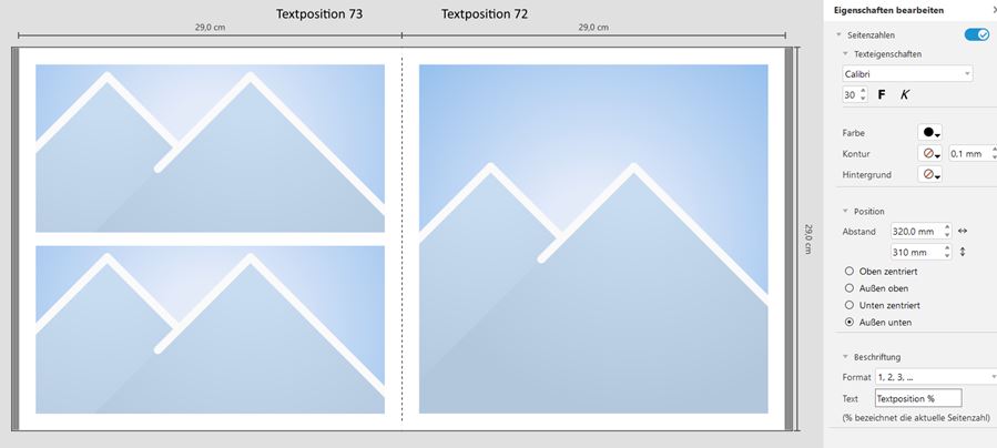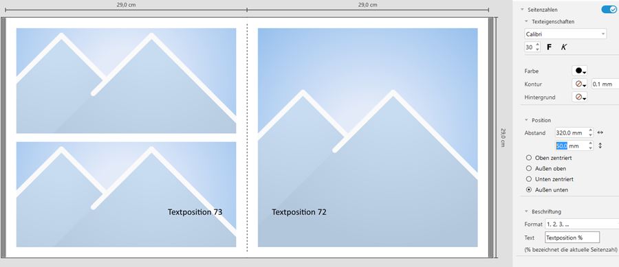 Nun stelle ich fest, dass es mir nicht gelingt, die Paginas wie gewünscht zu platzieren. Es scheint eine Beschränkung bei der Eingabe mindestens des horizontalen Werts zu geben: bei 50 mm ist Schluss. Ich hätte aber gerne einen größeren Abstand von der Außenkante der Seite, im gewählten Beispiel konkret 75 mm. Lieber Gruß, pitty