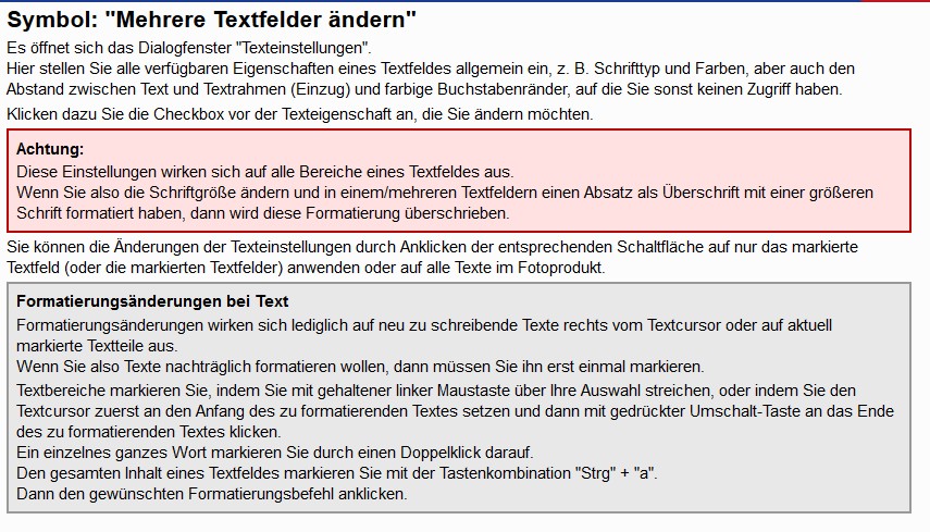 wenn du dich oben in der Werkzeugleiste zu Texteinstellungen durchhangelst, kannst du einen Button "Mehrere Textfelder ändern" anwählen. Alle ausgewählten Texteigenschaften (z.B. Schriftart, Schriftgröße, Schriftfarbe, ...) kannst du dann ändern und sie wahlweise auch pauschal allen Texten im Produkt zuweisen. Ausführlich ist das auch in der Hilfe beschrieben: Viel Erfolg beim Ausprobieren Re: Schriftart für ganze Buch ändern?Guten Morgen, okular!