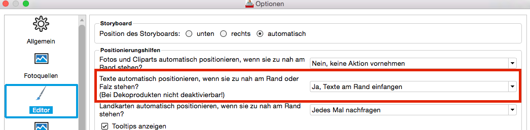 vielen lieben Dank für die ausführliche Beschreibung. Könnten Sie mir noch einen letzten Gefallen tun ? In den Optionen finden Sie im Bereich "Editor" unter "Positionierungshilfen", die Möglichkeit Texte einzufangen, die zu nah am Rand positioniert werden. Ist "Ja, einfangen" eingestellt, werden randnahe Texte ein Stückchen ins Buchinnere "geschubst", damit diese nicht angeschnitten werden. Dies könnte evtl. bei Ihnen bei der Fall sein. Liebe Grüße Jessica Liebe Grüße