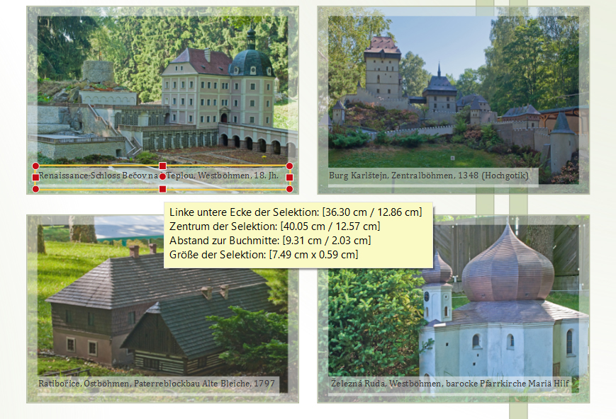 In meinen neuen Fotobuch habe ich einzelne Bilder beschriftet. Zur besseren Lesbarkeit habe ich den Hintergrund der Textfelder halbtransparent (über den Alphakanal) gestaltet. Die Textfelder sollten am unteren Rand genau mit den Passepartoutrahmen der Fotos abschließen. Nach dem Schließen und erneuten Öffnen des Fotobuches waren die Textfelder immer 0,59 cm hoch und ragten in die Passepartoutrahmen der Fotos hinein. Einen Hinweis auf ein evtl. zu kleines Textfeld bekam ich vorher auch nicht. Das ist jetzt für mich kein Grund zur Reklamation. Im Gegenteil: diese gedruckte Variante gefällt mir sogar sehr gut. Aber geplant war es eben anders ... Liebe Grüße