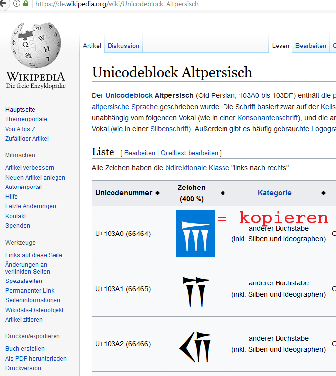Die von dir verwendete Schriftart ersetzt einfach das lateinische Alphabet durch das altpersische. Das funktioniert zwar, bedeutet aber, dass ich Schriftzeichen für Schriftzeichen zusammensuchen muss, wenn ich einen Text abschreibe. In der Google-Schriftart sind die Zeichen genau dort, wo sie hingehören. Ich kann also per copy/paste die Texte übernehmen. Anscheinend unterstützt die CEWE-Software den aktuellen Unicode-Standard nicht vollständig. Wobei die Keilschrift schon seit 2005 dazugehört. Besonders neu ist das also nicht. Re: Text wird nicht gespeichertGenau, es werden einfach den Zeichen einen Buchstaben zugewiesen, daher meinte ich auch, daß mein geschriebenes natürlich keinen Sinn macht. Du könntest aber das Alphabet ausdrucken mit unseren Buchstaben darunter und dann so abschreiben. Daher war meine Frage, was du alles schreiben möchtest. Aber du findest sicherlich den richtigen Weg. Vielleicht zeigst du uns ja dann deine erstellte Seite