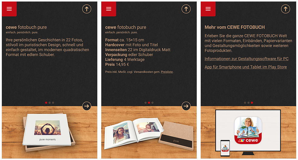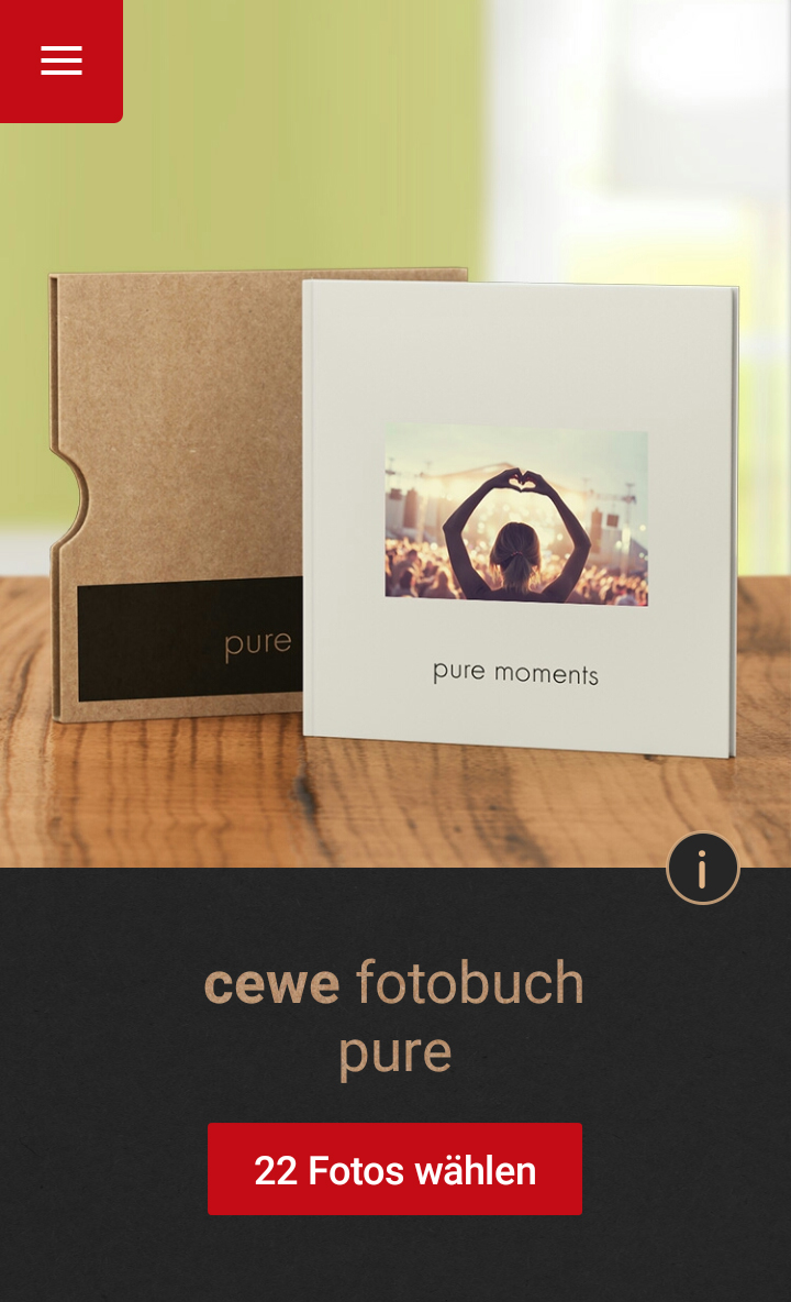 Wie der Name schon verrät, bietet die Pure App einem die Möglichkeit, ein schlichtes, puristisches CEWE FOTOBUCH zu erstellen und zu bestellen. Damit haben wir eine Produktneuheit eingeführt, da es das CEWE FOTOBUCH Pure nur in einem bestimmten Format (14 x 14 cm) gibt und die gesamte Gestaltung vorgegeben ist.