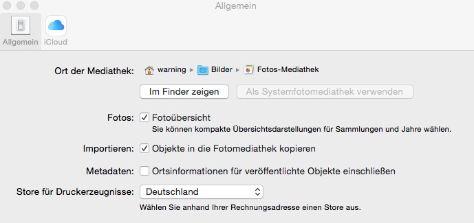 ich habe etwas zum Thema recherchiert und selbst einiges ausprobiert. Die genutzte Foto-Bibliothek wächst mit der Zeit gewaltig und kann Anwendungen beim Laden an ihre Grenzen bringen. Ob das der Fall ist oder der Stream defekt ist, lässt sich einfach herausfinden. 1. Halten Sie die ALT-Taste gedrückt und starten Sie dabei die Anwendung Fotos 2. Erstellen Sie eine neue Bibliothek mit "Neue erstellen" 2. Starten Sie Fotos, legen Sie dort ein neues Album an und füge 2-3 Bilder zum Testen hinzu. 3. Starten Sie die CEWE FOTOWELT und rufen Sie "Fotos" über den bekannten Weg auf. Lässt sich die neue Bibliothek samt Album aufrufen? Mit Schritt 1 können Sie nach dem Test die Standard-Bibliothek wieder einstellen. Welche Einstellungen haben Sie unter Fotos - Einstellungen - Allgemein vorgenommen? Würden Sie mir einen Screenshot erstellen und hier anhängen? Ich habe parallel einige Tests auf Sierra gemacht, konnte es aber auch hier nicht reproduzieren. Sylke Re: MAC: Bilder aus "Fotos" Datenbank werden nicht eingelesenLiebe Sylke,