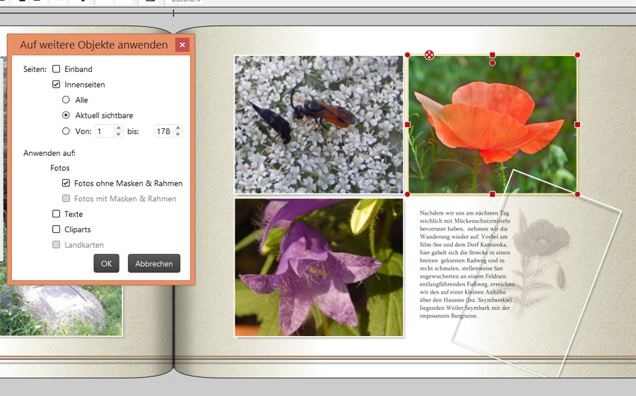 --> Auf weitere Objekte anwenden --> Haken setzen: -- Innenseiten -- Alle -- Fotos ohne Masken & Rahmen -- Fotos mit Masken & Rahmen Re: Schatteneinstellungen in einem Rutsch ändernSchon mal Danke für die Antwort. Ich habe mich da etwas unklar ausgedrückt.