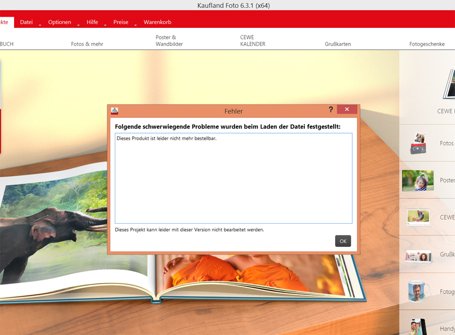 Nach meinem Urlaub wollte ich weiter an meinem Fotobuch arbeiten und bekam beim Öffnen des Buches folgende Fehlermeldung angezeigt: