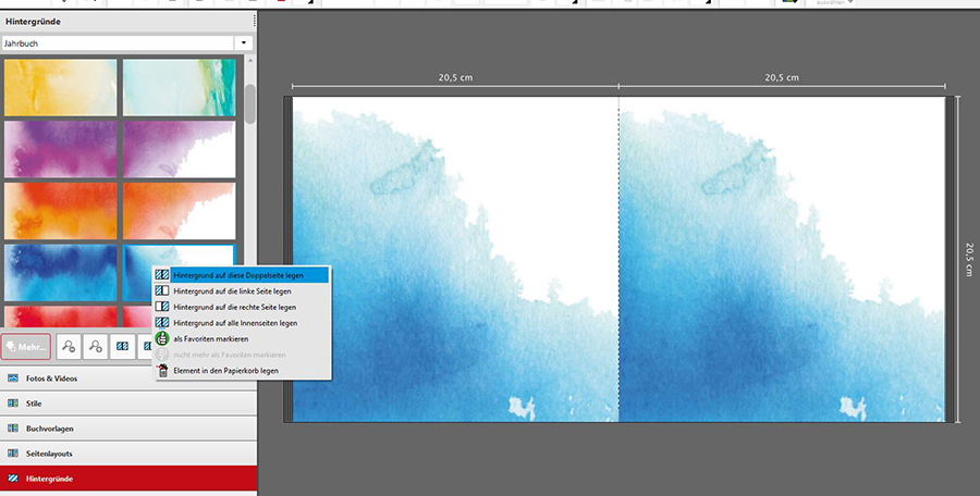 Während zum Beispiel "Mein CEWE Fotobuch 6.3.3" und "Meine CEWE Fotowelt 6.3.4" das gewünschte Ergebnis (1 Hintergrundmotiv über beide Seiten) erzeugen, wird bei "Meine CEWE Fotowelt 6.4.0" der Hintergrund auf jeder Seite separat angezeigt.