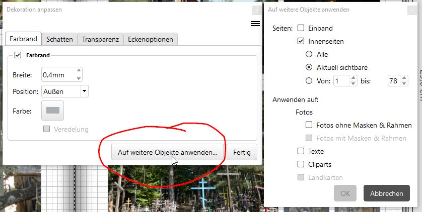 nein, diese Funktion ist deaktiviert, trotzdem hatte jedes neu eingefügte Foto den Farbrahmen. Da ich einige Fotos mit weißem Rahmen als Abstandshalter versehen hatte, ist mir das nicht aufgefallen. Andere Fotos hatten eine Verlaufsmaske, obwohl ich nur ein einziges Foto der Seite mit dem Verlauf hinterlegt hatte. Re: Keine ganz runde Sache? Kreis bei den MaskenReisetante hat geschrieben: trotzdem hatte jedes neu eingefügte Foto den Farbrahmen.