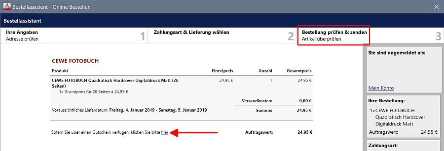 Außerdem fehlte die Eingabemaske für einen Gutscheincode. Dazu habe ich bei der Hotline um Veranlassung gebeten.