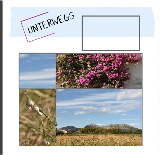 Das mit dem Rechteck war von mir sehr vereinfacht ausgedrückt. Ich zeig euch mal meine Seite. Ich bin mir noch nicht sicher, ob ich dieses Layout für das ganze Buch durchhhalten kann, weil der Rahmen auf jeder Seite variieren würde, je nachdem, wie die Bilder angeordnet werden. Das ist dann ein ewiges Gefummel.