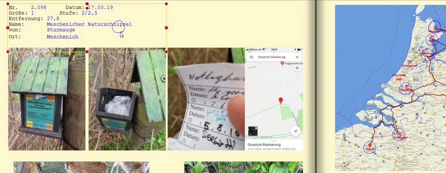 Auf der linken Buchseite oben links befindet sich ein Textfeld. Auf der rechten Seite ist eine Kartenskizze, auf der ich (per Clipart) ein paar Stellen hervorheben möchte. Dazu habe ich mir einen blauen Kreis genommen und ihn in die Größe gebracht, die ich gerne hätte. Damit ich nicht jedesmal wieder das Original entsprechend verkleinern muss und damit alle gleich groß sind, will ich die weiteren Markierungen durch copy/paste erstellen. Wie bekannt, fügt die Software leider immer auf der linken Seite oben links ein. Genau da steht mein Textfeld und es ist mir nicht möglich, die kopierte Clipart zu nehmen, um sie auf die rechte Seite zu verschieben.