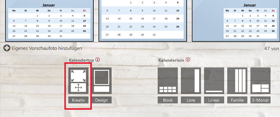 Welchen Kalendertyp hast Du ausgewählt? Bei Kreativkalender kannst Du alles frei gestalten und Layouts speichern.