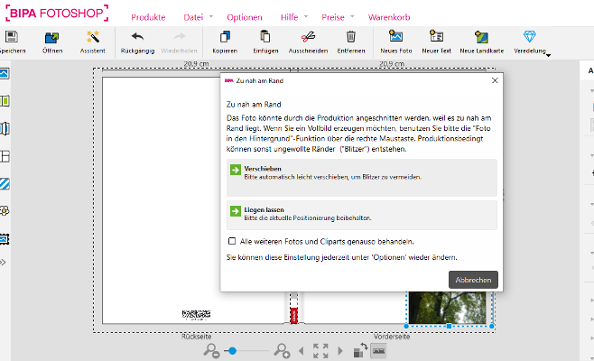 Wenn du ein Foto ganz am rechten Rand ausrichten willst, kannst du das manuell machen. Je nachdem, welche Einstellung du in den Optionen gewählt hast, bleibt das Foto so liegen, wie du es abgelegt hast (bei "Nein, keine Aktion vornehmen") oder du wirst gefragt, ob das Foto liegen bleiben soll (bei "Jedes mal nachfragen") oder ob das Foto automatisch so verschoben wird, so dass beim späteren Druck/Beschnitt keine Blitzer entstehen (bei "Ja, Fotos am Rand einfangen"). Wenn du ein Foto ganz am Rand platzieren willst ohne in die Gefahr zu geraten, später dort Blitzer zu sehen, wird das Bild von der Software über den Rand hinausgezogen, wie du es schon erfahren hast. Es ist deine Entscheidung, ob du das Risiko eines Blitzers eingehen willst oder nicht. Re: Objekte ausrichten - HilfeVielen Dank für deine Antwort.