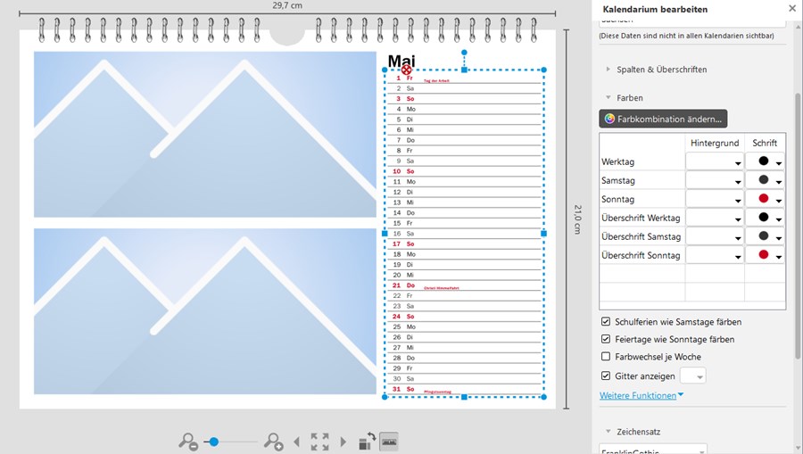 Wichtig ist offenbar, die Auswahl des Kalendariums zunächst zu übergehen und irgendeinen Kalender aus der Erstauswahl anzuklicken. Das Häkchen bei Feiertage kann hier ruhig schon gesetzt werden. Im Bearbeitungsfenster kann @Hamburger dann bei den Seitenlayouts gezielt sein Kalendarium 4 auswählen, das die Feiertage dann auch weiterhin artig farblich kennzeichnet. Liebe Grüße